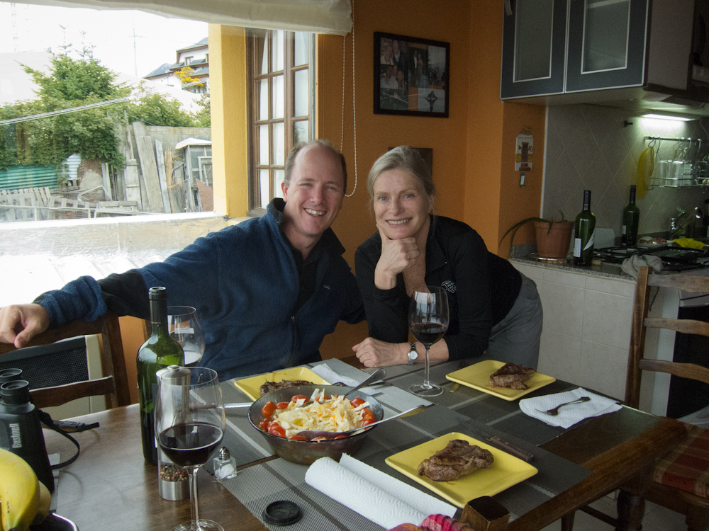 We again experienced the kindness of strangers here in Ushuaia. Alicia was the agent through whom we negotiated our cruise. When we met her at her home mid-week to finalize the paperwork, we got to know her story a little over a bottle of Argentinian wine. We were immediately impressed with how she came to Ushuaia ten years ago and built up her business and her reputation from scratch. She’s a real go-getter, very genuine, modest and down to earth. We found her to be inspiring. I think she was equally impressed with our story. It’s funny how you just hit it off with some people. Well, after completing the paperwork, and the first bottle of wine, she spontaneously invited us to stay for dinner. As she prepared the steak, and I made a salad, Chris cracked open the second bottle of wine. It was our first home made dinner, in somebody’s home since we left Canada. We really appreciated her hospitality.
